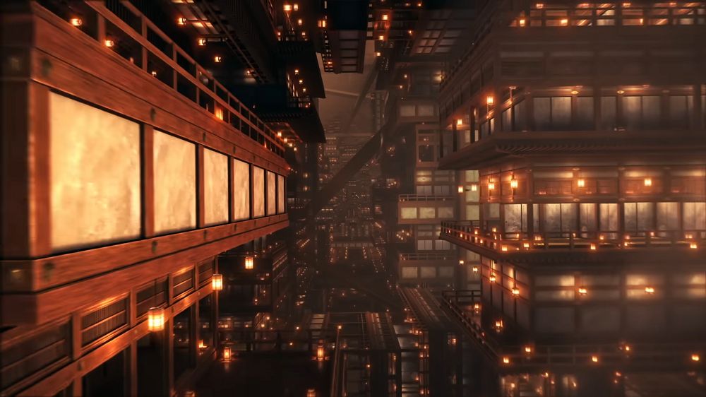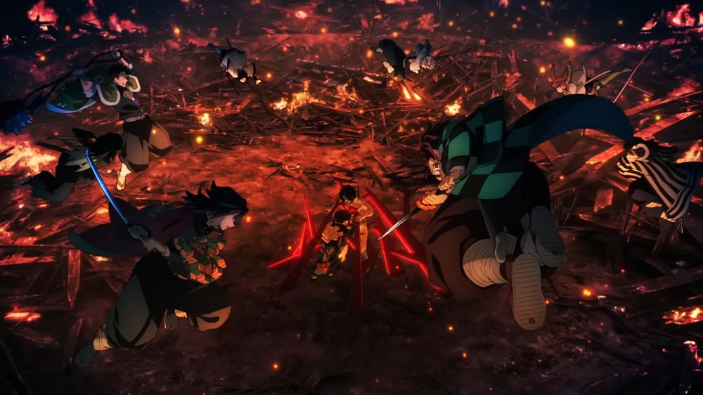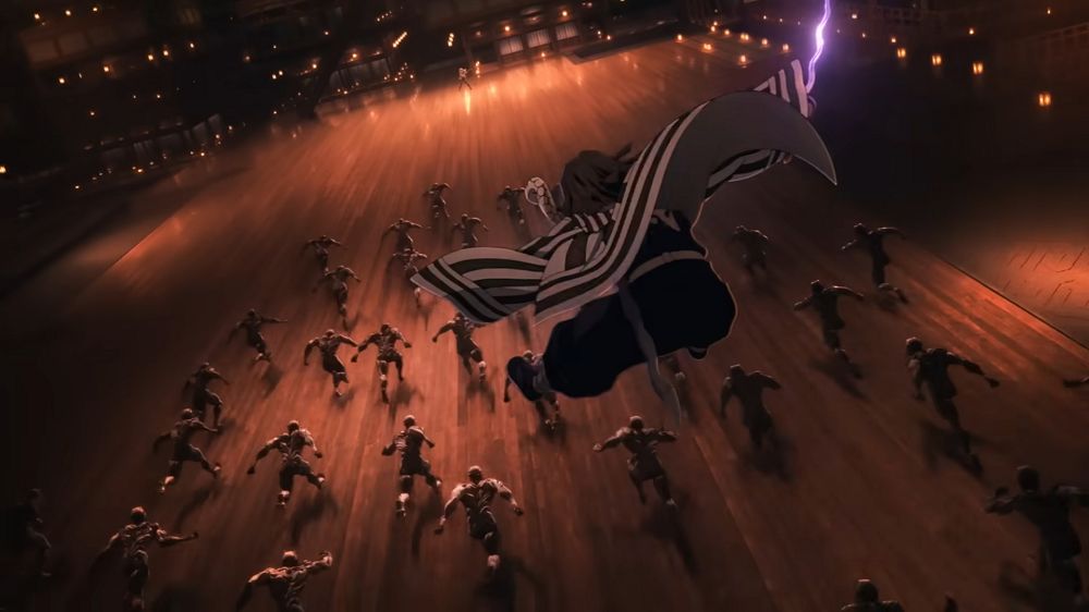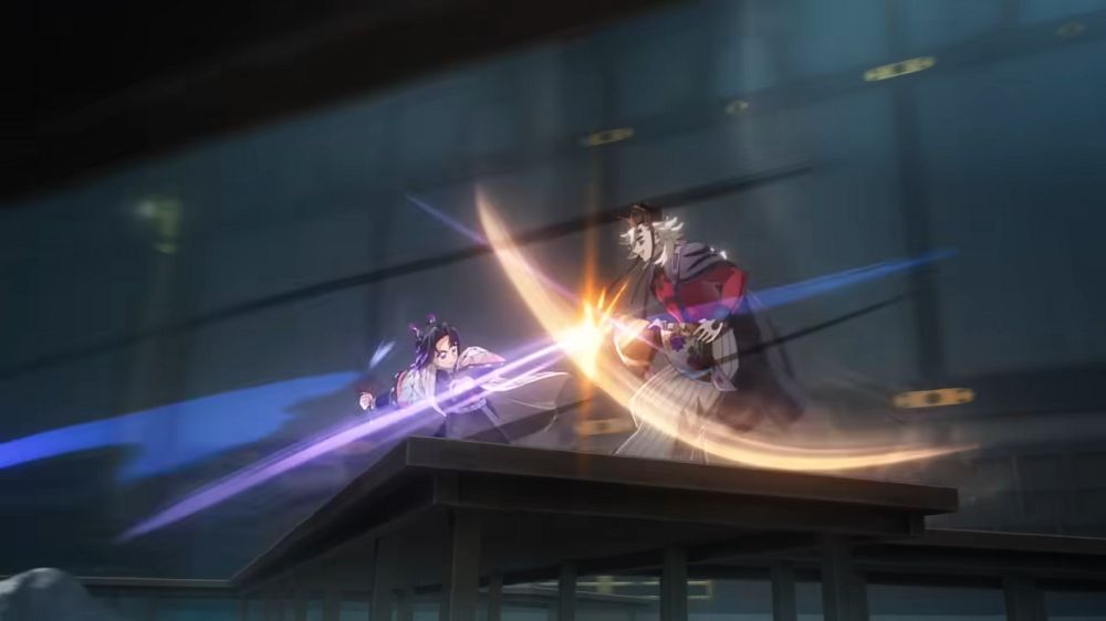 開頭所呈現的無限城,直接驚呆了所有觀眾!在這個架空的最終舞台,龐大且複雜,有著上下左右全部混亂的概念,建築還會隨時移動的超酷構想,在原作中不太好體現,但是幽浮社這卻做到了!像是背景卻又如行駛般的列車不段切換,視覺效果非常強。
