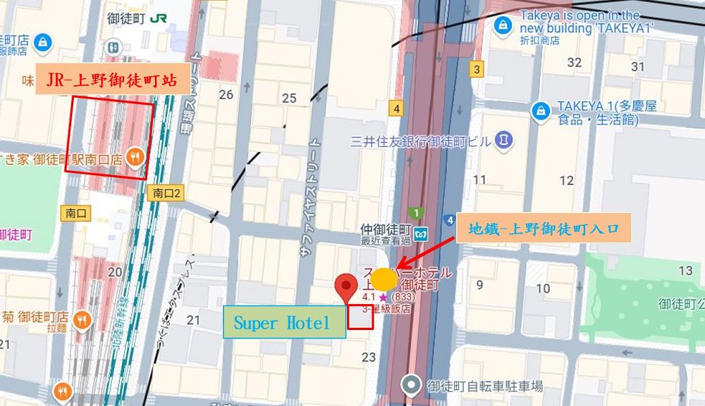 位於上野御徒町JR、地鐵附近,5分鐘左右的路程